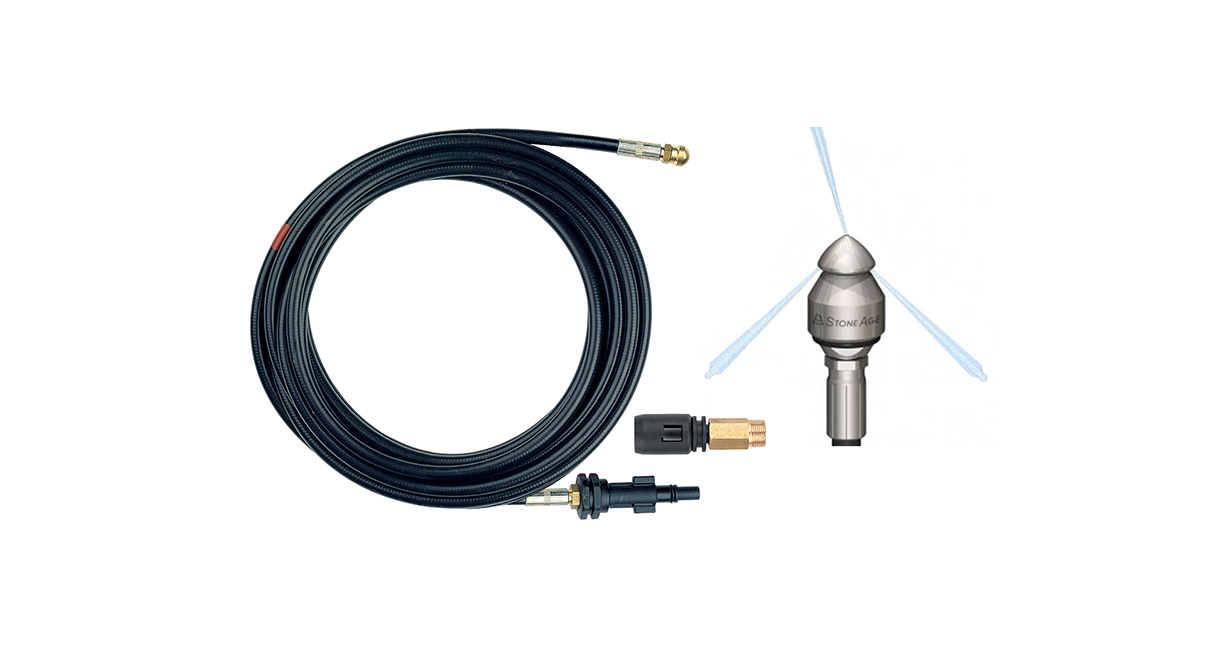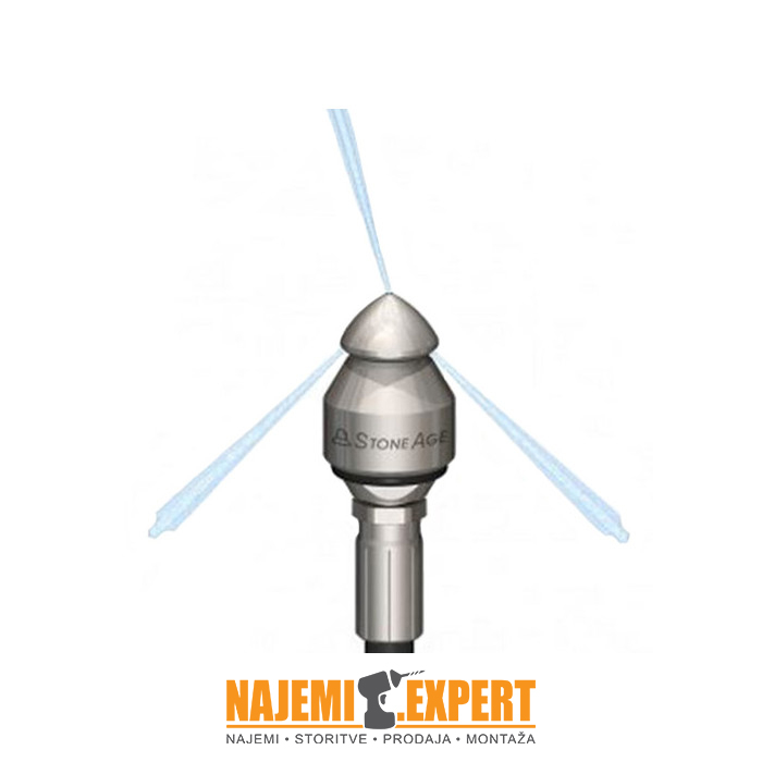 Štirje nazaj usmerjeni visokotlačni curki potiskajo gibko cev skozi zamašeno cev in tako odstranijo blokado. Neprekinjena oznaka in označevalni obroček prikazujejo, kako globoko je vstavljena cev.