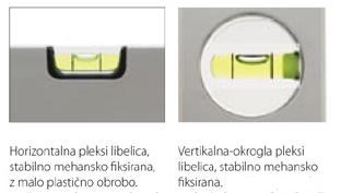 - Stabilno vgrajeni pleksi libelici omogočata trajno merilno natančnost in točne meritve v mejah 0,5 mm/m v normalni legi.